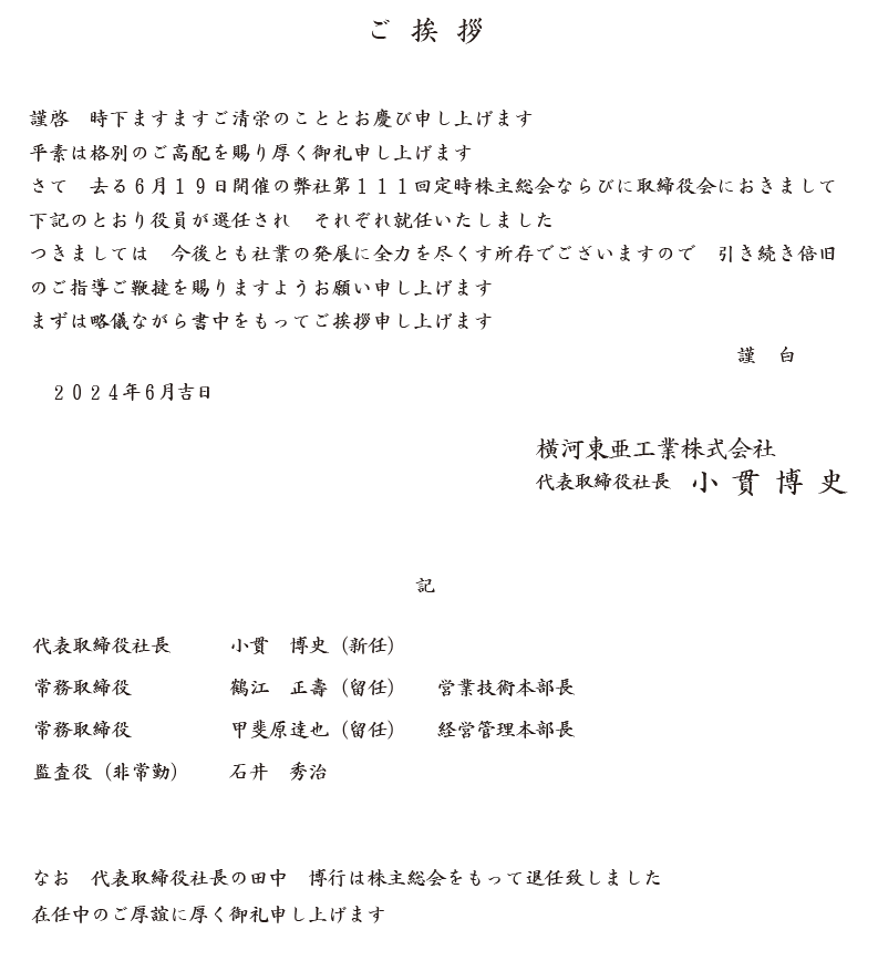 役員が改選されました。(社長交代) News 2024.06.19 2024年6月19日、株主総会において役員が改選されました。 挨拶状 第111期決算公告を掲載しました。 安全祈願の実施:2024年1月6日(土) 「川崎大師平間寺」 ニュース一覧